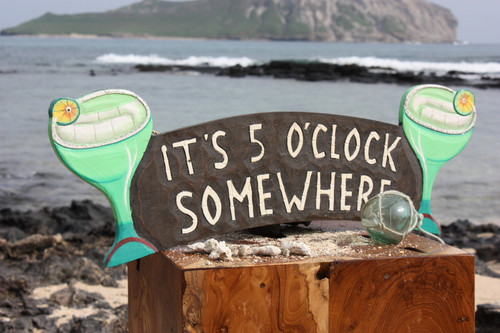 This is a artfully designed, tiki bar sign with the wording IT'S 5 O'CLOCK SOMEWHERE .