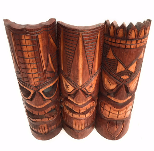 This is a fabulous set of three hand carved tiki masks with a beautiful antique finish. These masks represent the Hawaiian tiki gods, Ku, Kane and Lono - tikis of love, prosperity and family.